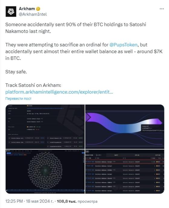 Другим интересным событием стало еще одно ошибочное перечисление, произошедшее в недавние дни. На высоте блока 843,872 некий пользователь случайно отправил 0,10754671 BTC на кошелёк Накамото, что составляет примерно 7,211 долларов США. Это стало известно благодаря аналитической платформе Arkham Intelligence, следящей за транзакциями в блокчейне. Похоже, отправитель намеревался сделать пожертвование в криптовалюте Pups Token, но ошибся, отправив почти весь баланс своего кошелька в биткоинах.