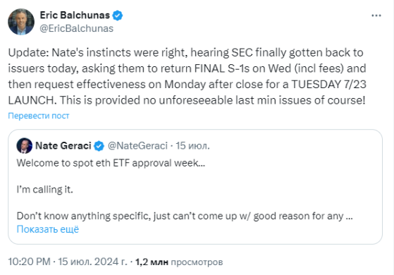 В последние недели стало известно о возможном запуске биржевого инвестиционного фонда (ETF) на Ethereum в США. Эрик Балчунас, ведущий эксперт в области инвестиционных фондов, подтвердил информацию, ранее озвученную Нейтом Джерачи, президентом компании ETF Store. По его словам, запуск может состояться в ближайший вторник, при условии отсутствия непредвиденных обстоятельств. Ситуация вызывает повышенный интерес у инвесторов, так как спотовые фонды способны значительно изменить ландшафт криптовалютного рынка.